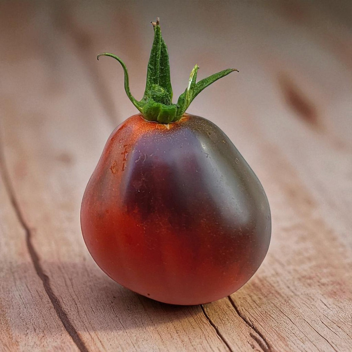 Blue Pear Tomatoes are indeterminate plants that produce medium-sized, pear-shaped fruits throughout the season. The anthocyanin pigmentation in the skin gives the shoulders their dramatic blue-black coloring, which intensifies in full sun. Fruits ripen from indigo and green to deep red, creating a two-tone effect that’s both striking and flavorful.